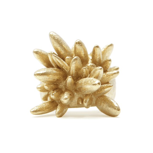 Anel dourado, com hastes em forma de picos. Acabamento com textura.