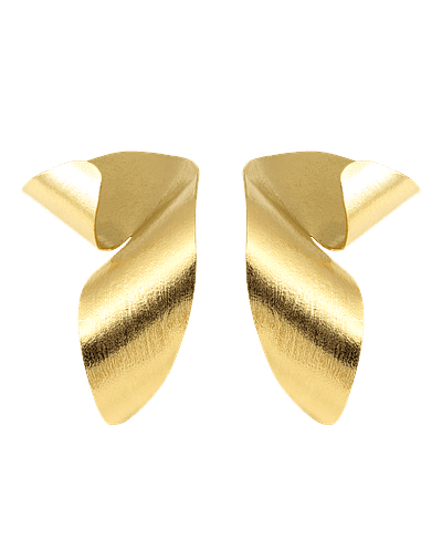 Brincos dourados de design escultórico, com formas dobradas que criam volume e movimento. O acabamento mate, com textura riscada, confere profundidade e um carácter marcadamente contemporâneo à peça.